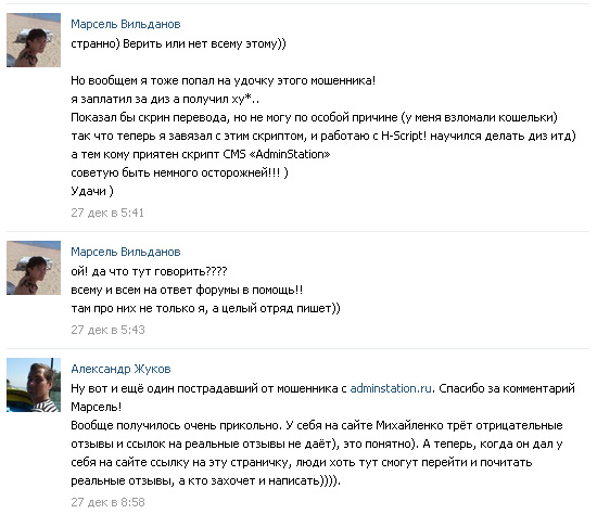 [17:25:04] minatrix.ru: Но вообщем я тоже попал на удочку этого мошенника! я заплатил за диз а получил ху*.. Показал бы скрин перевода, но не могу по особой причине (у меня взломали кошельки) так что теперь я завязал с этим скриптом, и работаю с H-Script! научился делать диз итд) а тем кому приятен скрипт CMS «AdminStation» советую быть немного осторожней!!! ) Удачи )